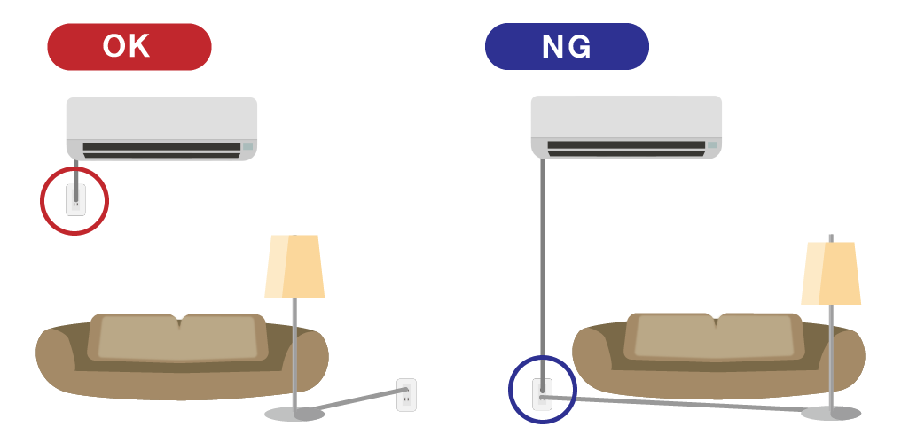 エアコンは消費電力が大きい機器のため、分岐コンセントや延長コードを利用してのコンセントでエアコンの電源を確保することは大変危険です。
